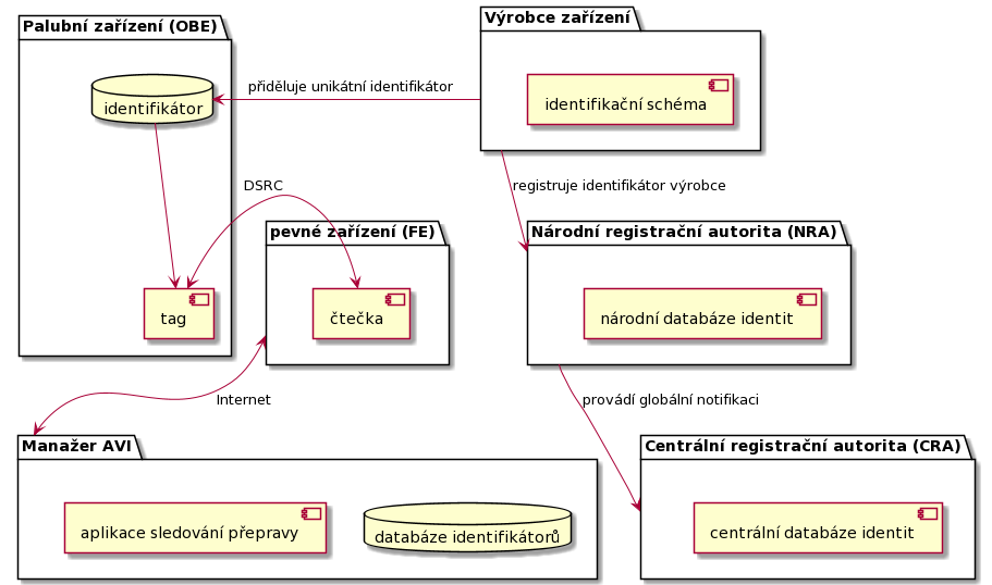 Automatická identifikace zahrnuje systém či jeho část, zodpovědnou za bezkontaktní a jednoznačné určení identity sledované jednotky. Vozidlo, nákladní jednotka nebo položka nákladu může být jednoznačně identifikována prostřednictvím palubního zařízení (OBE), které je pevně spojeno s tagem obsahujícím identifikační údaje. OBE předává identifikační informace z tagu do čtečky umístěné v pevném zařízení (FE) na straně infrastruktury, které je dále zpracovává a posílá k vyhodnocení do databáze manažera AEI.
