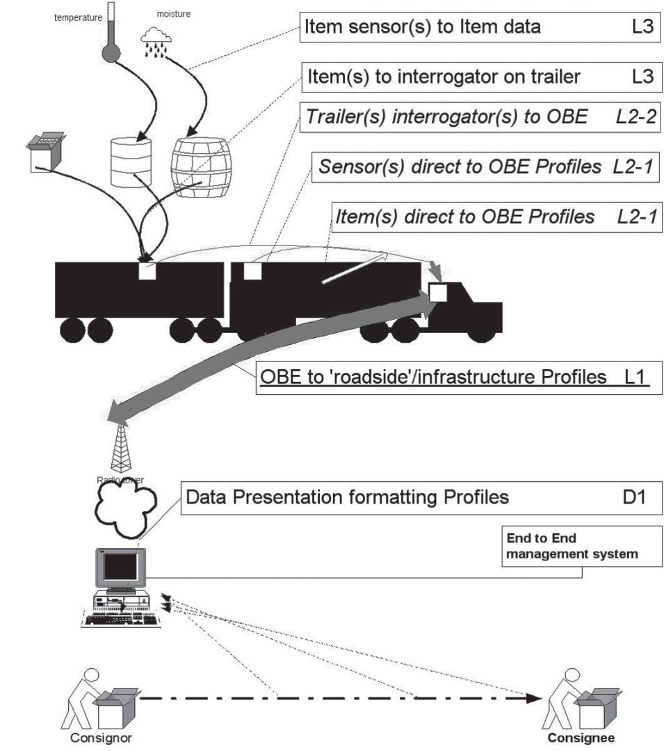 Komunikace senzoru (sledujícího fyzikální veličiny souvisící s přepravovaným nákladem) s tagem může být zajištěna kabelem nebo senzor může být přímo v tagu nebo může být použito dotykové nebo bezdotykové zařízení. Senzor může být k tagu připojen i bezdrátově. Obrázek 16 normy ukazuje možnosti přenosu dat, a to z tagů do čteček/interogátorů, z přívěsů/návěsů do palubní OBE, a z OBE na infrastrukturu.