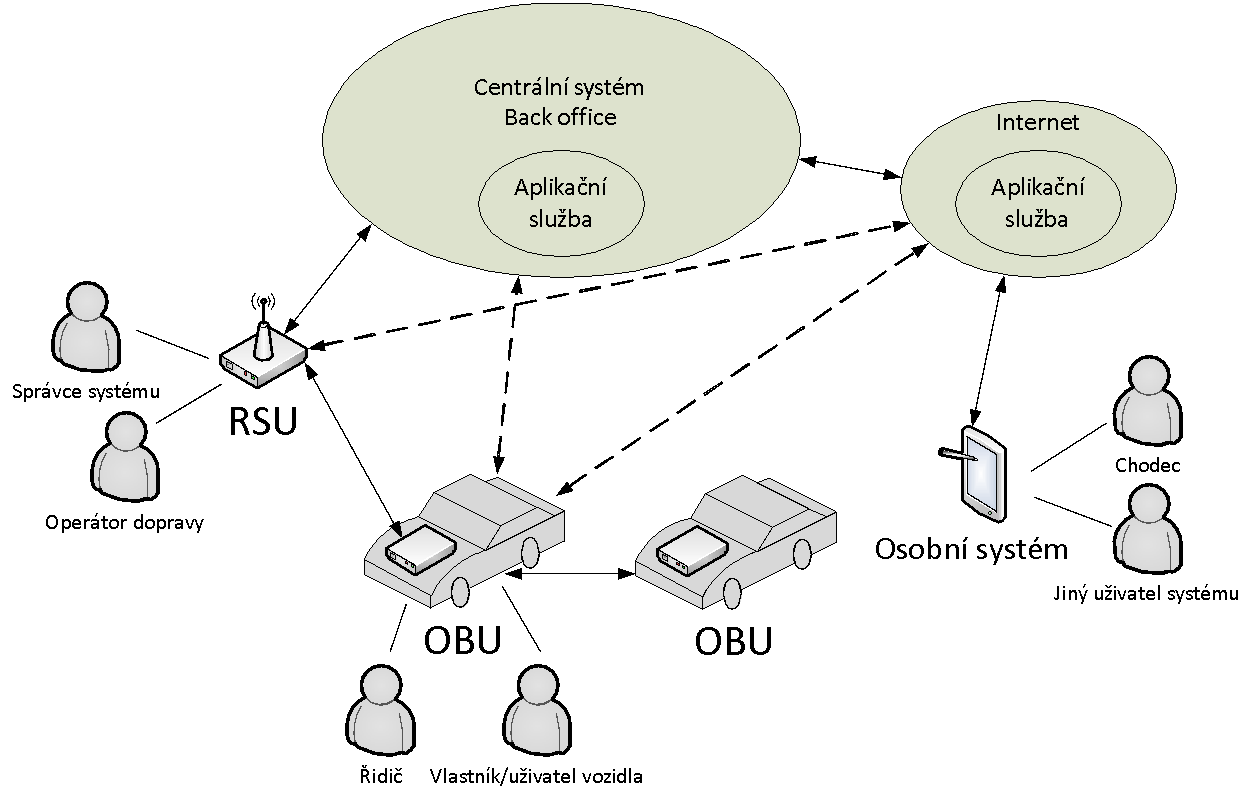 - Komunikace – umožňuje fyzickou výměnu dat, včetně komunikace ITS-stanice, zpravidla prostřednictvím standardu ITS G5 a internetu.
