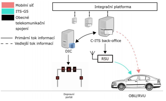 C-ITS aplikace Přenos informací do vozidla je realizována pomocí komunikace C-ITS jednotek – stanic. Jednotka umístěná ve vozidle přijímá C-ITS zprávy obsahující informace, které se mají zobrazit ve vozidle. Pro potřeby této aplikace se jedná o zprávy typu IVIM (In-Vehicle Information Message). Ty jsou vysílány jiným typem C-ITS stanic, kterými jsou jednotky na straně infrastruktury – RSU. Alternativně se může jednat o C-ITS stanici představovanou tzv. C-ITS Back Office neboli centrálním prvkem systému, který vysílá zprávy prostřednictvím sítě mobilních operátorů na vozidlové OBU jednotky. V obou případech je na této C-ITS stanici vygenerována zpráva IVIM a ta je vysílána v režimu „broadcast“ – tedy všem jednotkám, které ji mohou přijmout. Jako technologie přenosu je použita buď DSRC komunikace ITS-G5 (v případě, kdy vysílá jednotka umístěná na infrastruktuře), nebo mobilní síť LTE v případě, že je zpráva IVIM generována a vysílána z Back Office. Používá se také kombinace obou způsobů v případě, že je IVIM zpráva generována v BO, odkud je prostřednictvím LTE sítě rozesílána na infrastrukturní jednotky RSU, které ji dále šíří prostřednictvím ITS-G5 komunikace.