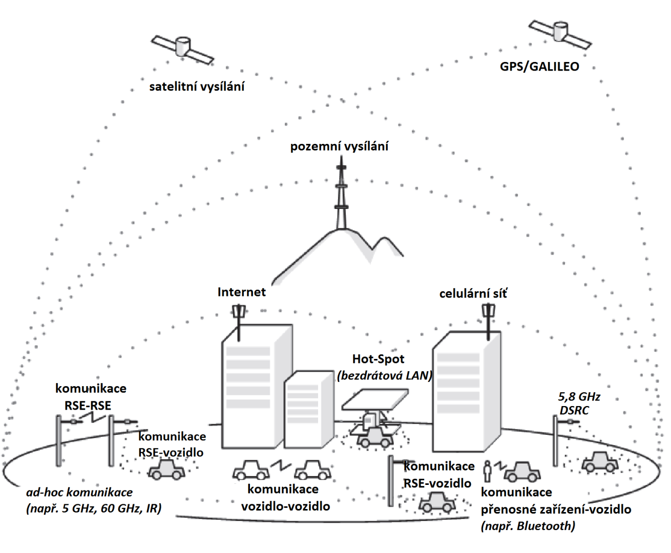 Komunikace ITS je nadstavbový pojem, který pro využívá nejrůznější komunikační protokoly, které jsou běžně dostupné na infrastruktuře. Jsou to zejména datové protokoly sítí GSM (2G, 3G, 4G), protokoly na bázi InfraRed, mikrovlnné spoje v pásmu 5 a 60GHz, dále pak bezdrátové sítě podle standardů IEEE802.16 a IEEE802.20 a veřejné datové sítě jako např. pozemní digitální vysílání DAB a DVB (obrázek 1).