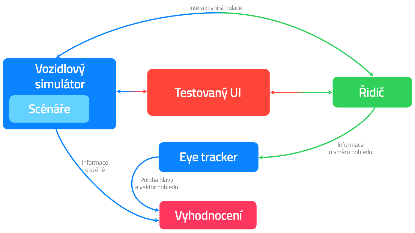 Ověřované zařízení je umístěno uvnitř vozidla či vozidlového simulátoru. Ten je vybaven eye-trackingovým systémem (pokud jde o fixní instalaci distančního zařízení) či je eye-tracking umístěn přímo na testovaném řidiči. Zaznamenávají se jednak data z vozidlového simulátoru (pozice ve scéně v čase, trajektorie atd.), tak data o řidičově pohledu z eye-trackingu, ze kterých je určen vektor pohledu v čase. Z těchto dat lze odvodit polohu hlavy a dále např. sledovaná oblast či ovládací prvek. Princip realizace měření s využitím nástrojů sledování pohledu ukazuje diagram na obrázku 2.