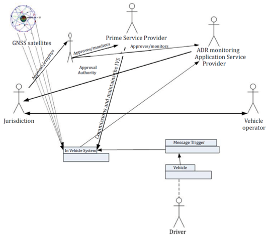 Sledování přepravy nebezpečného zboží jako aplikace v univerzální vozidlové jednotce musí mít předem nastavené role v systému, dané poptávkou, legislativou a pravidly správního úřadu. Role mají své zodpovědnosti a pravomoce. V dohodě ADR je uvedeno, jaké nebezpečné věci se smějí po silniční síti vůbec přepravovat a jaké povinnosti musí splnit osoba předávající nebezpečné věci k přepravě, dopravce a osoba zajišťující vykládku těchto věcí; to je nutné zachovat i při využívání kooperativních ITS pro informační toky sladěné s materiálovými toky přepravovaného zboží. Po pověření ze strany správního úřadu se aktéři ujmou své role, nastaví a ověří hardware, software a komunikaci pro informační toky aplikační služby tak, aby bylo možné posílat balíčky zpráv mezi sebou navzájem. Po schválení systému je možné rozjet provoz. Další, zde nejmenované, aplikační služby v univerzální vozidlové jednotce je možné vzájemně doplňovat nebo sdružovat.