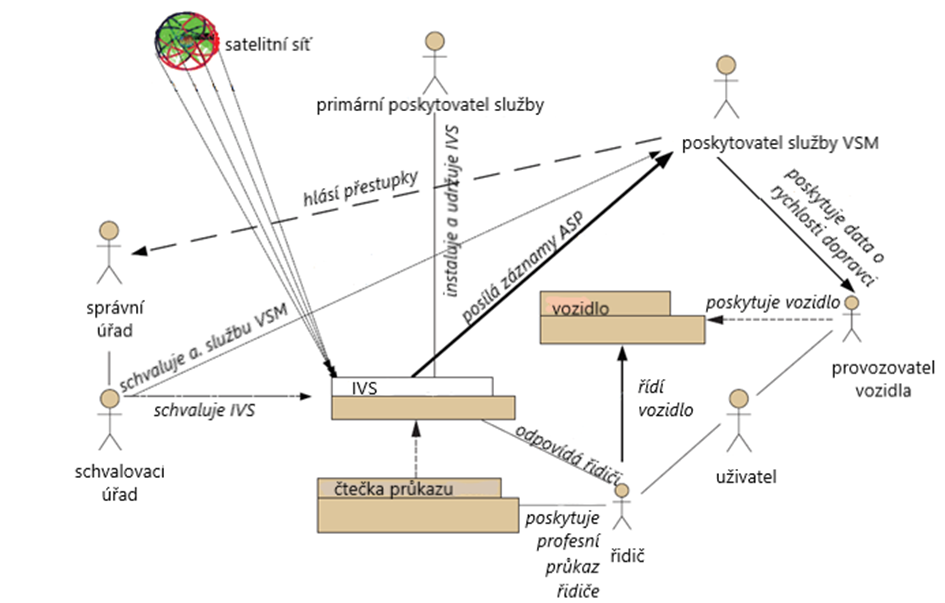 patří dopravci a je jím obvykle i provozováno. Vozidlo je řízeno oprávněným a proškoleným řidičem, identifikovaným do čtečky profesního průkazu řidiče v rámci IVS nebo tachografu. Součástí vozidla je IVS: IVS je zprovozněn a servisován primárním poskytovatelem služby. IVS je součástí vozidla a sbírá data z vozidla a signál z GNSS a popřípadě přijímá nebo poskytuje i data z/do infrastruktury a od/k poskytovateli služby. IVS zajišťuje konektivitu interní ve vozidlové soupravě a externí. Komunikuje s poskytovatelem aplikační služby a posílá mu data o své pozici a rychlosti, která generuje.