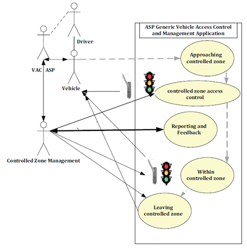 Řízení přístupu nákladních vozidel jako aplikace v univerzální vozidlové jednotce musí mít předem stanovené role, které jsou dány poptávkou, legislativou a pravidly správního úřadu. Role mají své zodpovědnosti a pravomoce. Po pověření ze strany správního úřadu se aktéři ujmou své role, nastaví a ověří hardware, software a komunikaci pro informační toky aplikační služby tak, aby bylo možné posílat balíčky zpráv mezi sebou navzájem. Další, zde nejmenované, aplikační služby v univerzální vozidlové jednotce je možné vzájemně doplňovat nebo sdružovat.