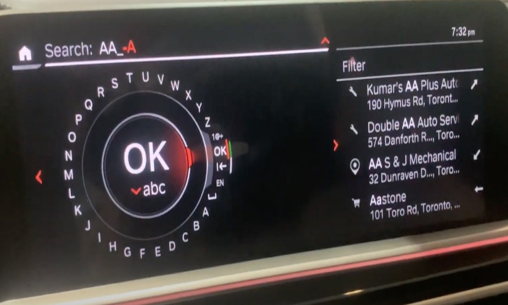 Obrázek 2: Ukázka textového dialogu na displeji, odezva řidiče je realizována za pomoci výběrové rozety (vlevo) nebo virtuální klávesnicí na dotykovém displeji.