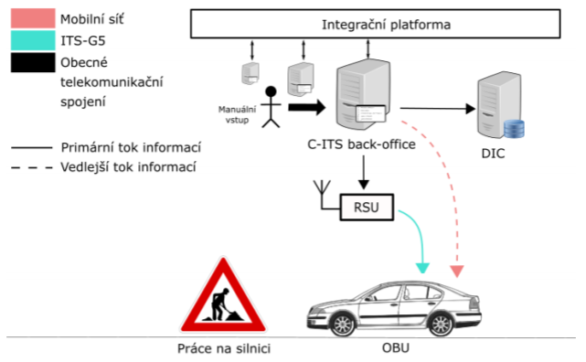 Na výše uvedeném schématu jsou znázorněny C-ITS stanice potřebné pro realizaci C-ITS aplikace Varování před pracemi na silnici. Z funkčního pohledu obecného C-ITS systému jsou všechny stanice prakticky shodné – jejich klíčovou vlastností je možnost vytváření a zpracovávání C-ITS zpráv jednotným standardizovaným způsobem. Za tím účelem mají jednotky implementovánu sadu SW protokolů a aplikací.