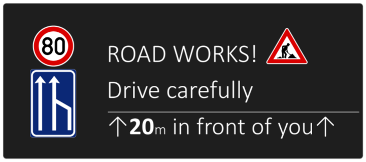 Obrázek 15: Příklad upozornění na práce na silnici zobrazené na displeji ve vozidle